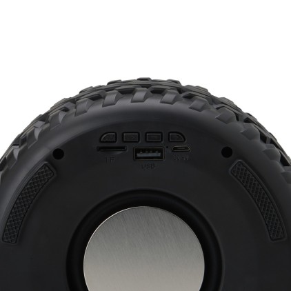 Caixa de som multimídia TWS formato pneu com luminária RGB. Qualidade sonora e conectividade total: compatível com bluetooth, rádio FM, cartão TF (MicroSD) e pen drive.