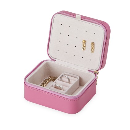 Possui compartimentos internos para anéis, brincos, pulseiras e colares.